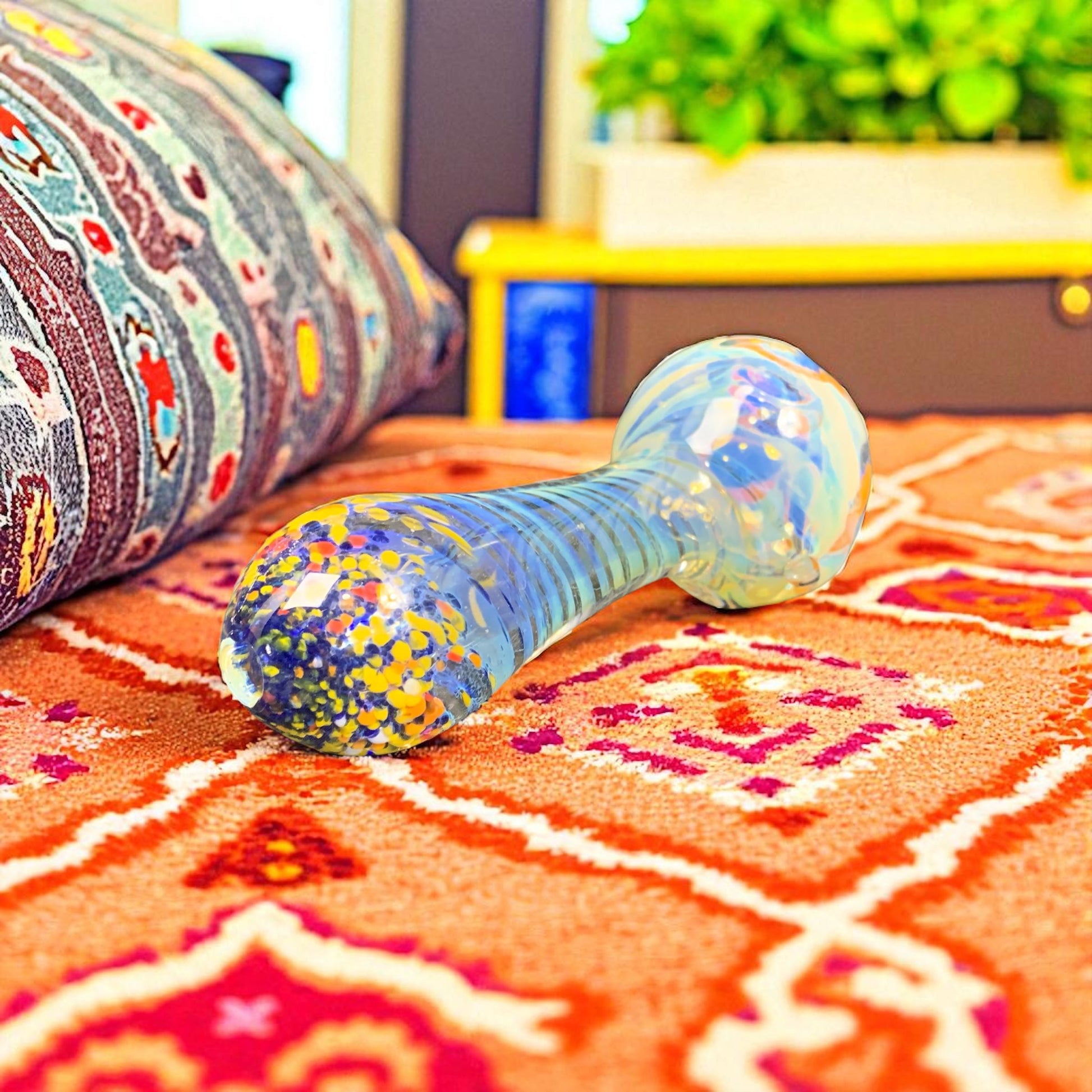 The Éclat Bleu radiates brilliance through deep sapphire tones flecked with golden light. Its elongated form carries a refined stripe pattern, while the speckled base glimmers like constellations across a twilight sky. A piece that captures movement, color, and elegance, this collectible glass art stands as a bold statement of modern luxury.