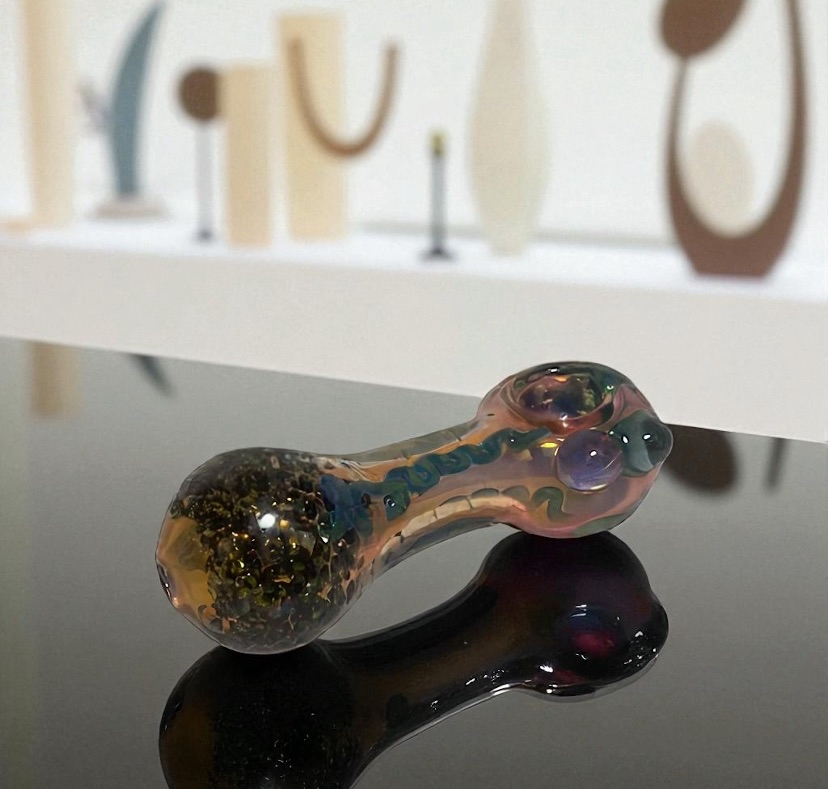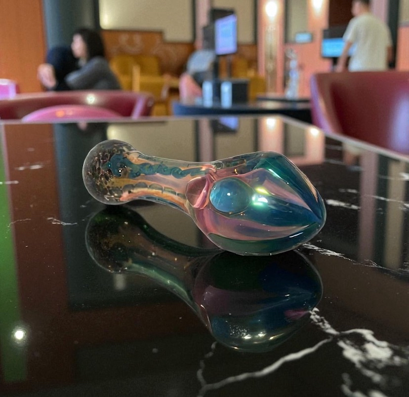 “Aurora Drift” moves like light through glass. This piece glimmers with ethereal bands of blue, rose, and soft green, shifting subtly as you turn it. The form is smooth and flowing — a rounded bowl transitions into a slender, graceful stem — while gentle ridges and accents add texture and catch the glint of ambient light.