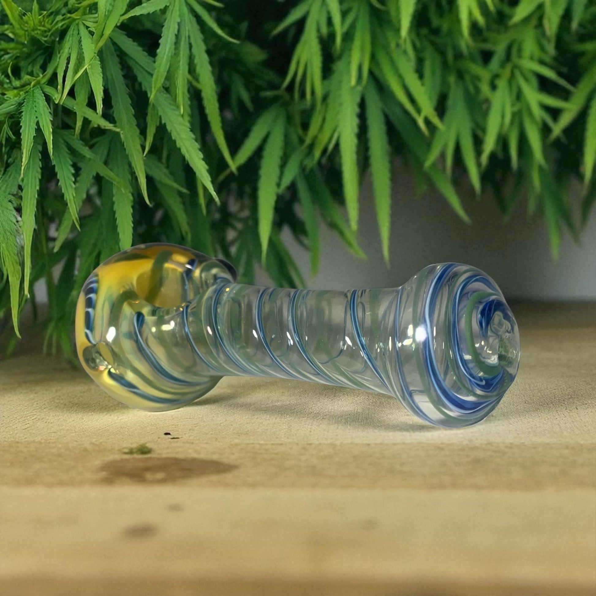 Glowing with elemental energy, the Solar Wave combines sunlight and water into a single fluid design. Its clear body is wrapped with spiraling blue ribbons that mimic flowing tides, while a burst of golden yellow radiates warmth at the head. Balanced between cool and warm tones, this piece captures the movement of nature in glass form.